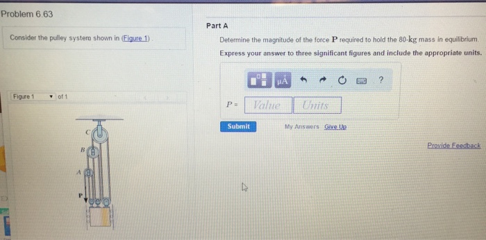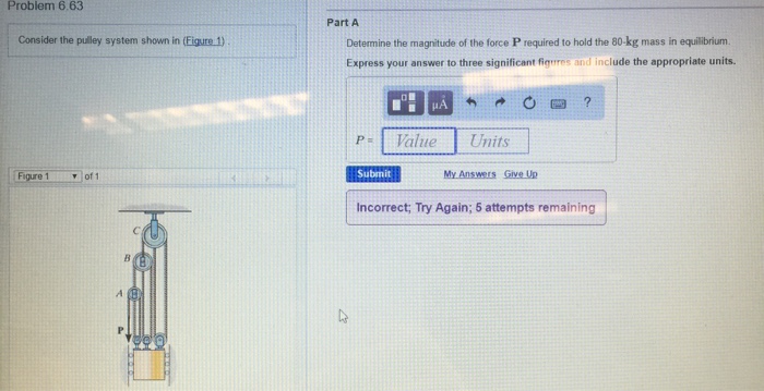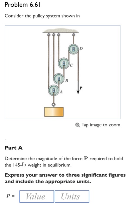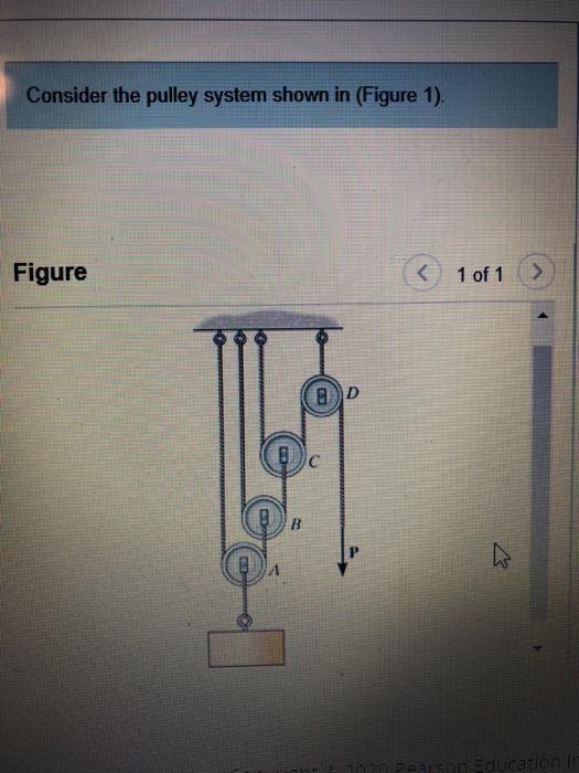 Figure 1 of 1 BD C B A Part A Determine the magnitude of the force P required to hold the 150-lb weight in equilibrium. Choose the correct alternatives. Consider the mass-pulley system shown in thefigure.